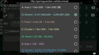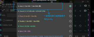 索,gg就开始搜索数据了,当弹出搜索类型让你选择的时候我们一般是选择白色的auto,也就是搜索所有类型数据,虽然比较慢,但在如今的设备性能上面使用已经绰绰有余。
