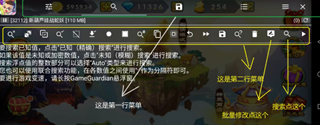 GG主界面有两行菜单,第一行是功能大板块,分别为:设置,搜索,保存列表,地址列表,和关闭界面,我们一般是切换到搜索这一页。第二小行按钮是我们主要需要用到的。