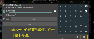 使数值进一步变化,方法同上,可以再花一些钻石或者购买钻石,然后继续返回gg改善结果。运气够好的话,最终会得到只有几个数值,此时,就可以开始修改数值了。修改数值的方法是点击列表中的其中一个数值,然后输入一个你想要得到的数值,假设我想要9999个钻石,就输入9999,然后点击是,即可完成修改,你也可以