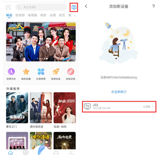 手机和电视连接同一WiFi。电视端保持易投屏页面打开。手机端打开【易互动】,先点击左上角,连接上电视。