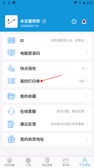 1、首先打开快点云打印app,登录后进入【个人中心】。