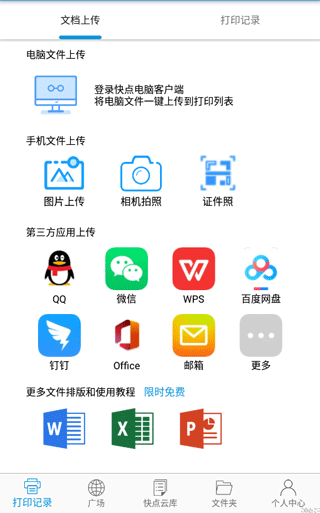 打开快点云打印APP或网页端,点击“打印”按钮,从手机或电脑中选择要打印的表格文件(支持DOC、XLS、PDF等格式),上传至打印列表。