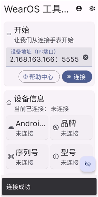 4、我们需要在手机上下载wearos工具箱,将上一步显示的IP输入至设备地址栏里,然后点击连接,等待显示连接成功。