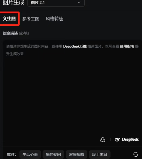 2、输入描述,支持中英输入,字数限制在500字以内,如果暂时没有灵感可以随机生成。提示词最好说明具体的要求,丰富且清晰。公式:主体+行为、特征、情景、情感+时间+环境+动作行为+质感、构图、色调、细节。