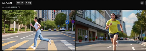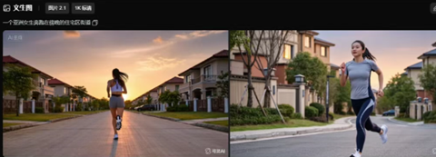 因为老师输入的文字比较简单,所以生成的图片可能不是想要的,接着,我们在添加一些文字,比如“一个亚洲女生奔跑在傍晚的住宅区街道”,再次生成图片;效果如下图所示;