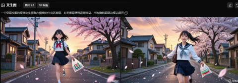 我们继续增加文字,比如“一个穿着校服的亚洲女生奔跑在傍晚的住宅区街道,右手提着便利店塑料袋,书包侧斜着路边樱花盛开”,生成效果如下图所示;