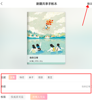 输入共享手帐本的主题和名称,设置权限(如「仅成员可见」或「所有人可见」),点击「确定」。