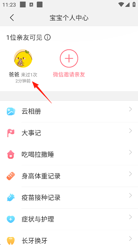 2、可以看到当前登录账号为爸爸角色以及爸爸访问的记录,点击侧边的微信邀请亲友以邀请宝宝其他亲属加入。