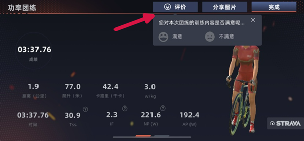 完成团练进入结算页时,在右上方可以看到评价提示,点击即可进入评价页面。如果你在退出后又想评价,还可以进入首页-记录中点击团练运动记录留下评价~