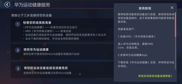 点击【设备连接】按钮,在动感单车以及划船机模式下可以看到【华为运动健康服务】卡片,里面包含详细的连接使用教程。如果您的单车/划船机设备支持华为HiLink连接,可打开手机里的华为运动健康APP连接顽鹿竞技(仅支持安卓设备)。