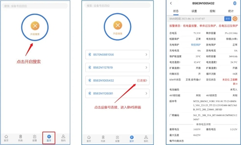 b. 点击设备号将自动连接,成功后再次点击设备号就进入BMS界面,此时可以查看BMS信息