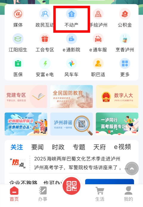 1、打开酒城e通App后,点击【不动产】进入相关页面。