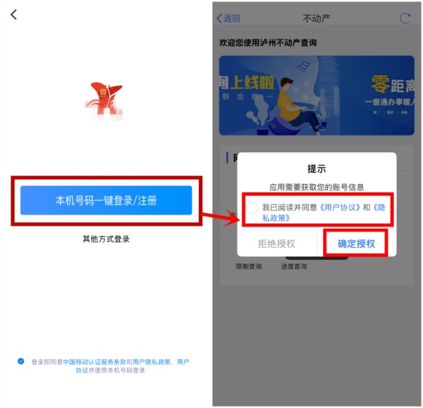 2、点击【本机号码一键登录/注册】→勾选【我已阅读并同意用户协议和隐私政策】→点击【确定授权登录】完成验证。