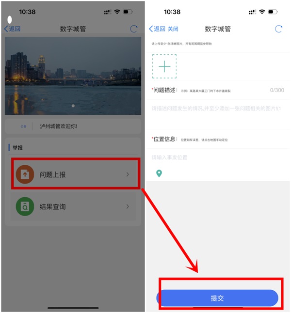 点击【问题上报】,按提示填写内容后点击【提交】,系统将自动派发给相关部门处理。