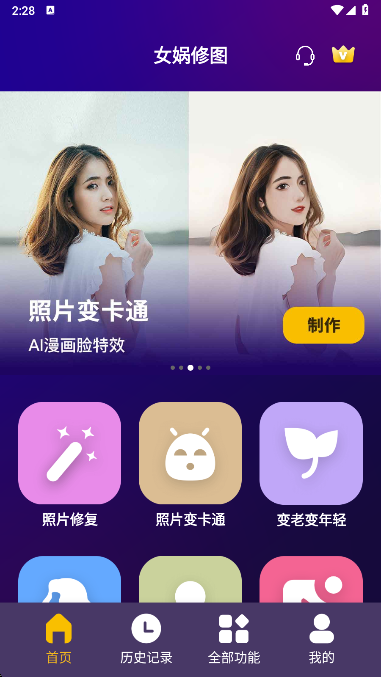 女娲修图app是照片修复工具,含多功能ai照片修复软件。能智能高清修复上色老照片,还有众多特效功能。可导入图片修复上色、制作卡通漫画头像、实现人物返老还童、制作证件照等,提供大量修图素材,操作便捷,满足多样需求。