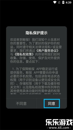 1、在本站下载打开鲸探,阅读弹出的隐私保护提示,点击【同意】;