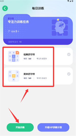2、在主界面舒尔特训练板块查看专注力数据,点击开始训练。