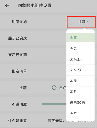 可以选择:显示全部任务、显示今日任务、显示近3天内任务、显示近7天内任务、显示本周(周一至周日)任务、显示本月任务、显示近30天任务、显示今年任务。