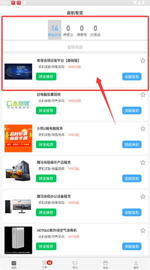 3、通过商机有奖页面查看各类机会,可转发推荐或参与贡献。