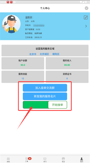 查看收入信息:打开App左下角“我的”,在个人中心页面可以查看到账收入、账户余额、服务工费等信息。