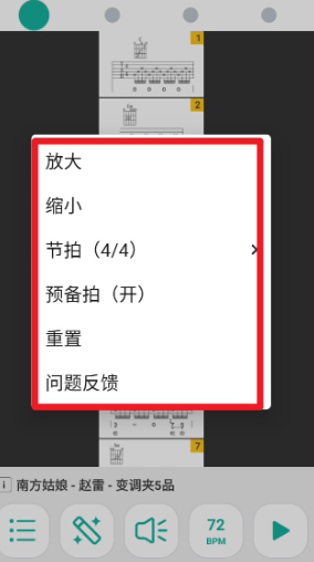 5. 点击界面左下角的菜单,还能进行放大、缩小、节拍切换或重置操作,并可反馈问题。