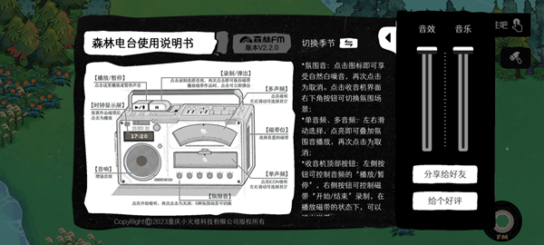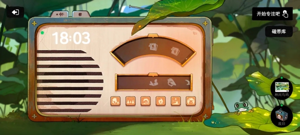 它有拟物风收音机功能,能收听大自然的声音,点背景插画上的实体收音机就能看到。拟物风收音机的样式有复古、随身、废旧、科幻这些,还有日光海滨、萤虫旅夜、森林.