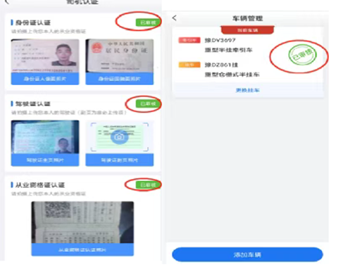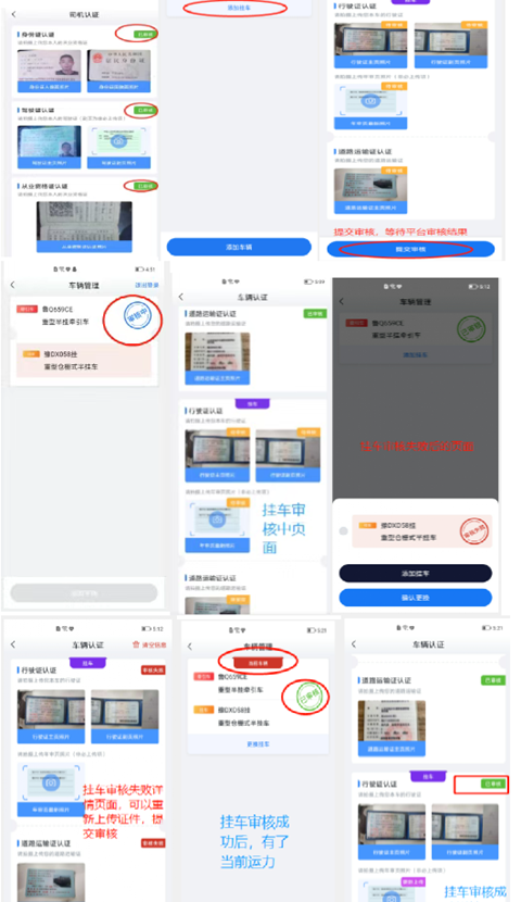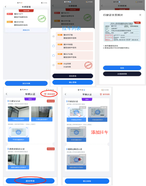 (1)点击添加挂车,上传正确清晰的相关证件,提交审核并等待平台审核结果