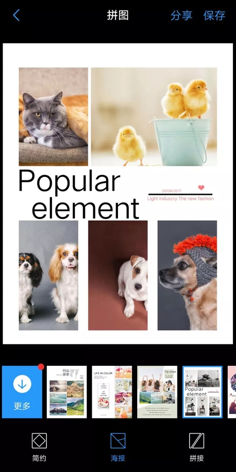 编辑完成后可以直接点击「分享」将拼图分享出去,也可以点击「保存」将拼图存储在手机上。打开你的相册,选几张喜欢的照片拼一拼吧!