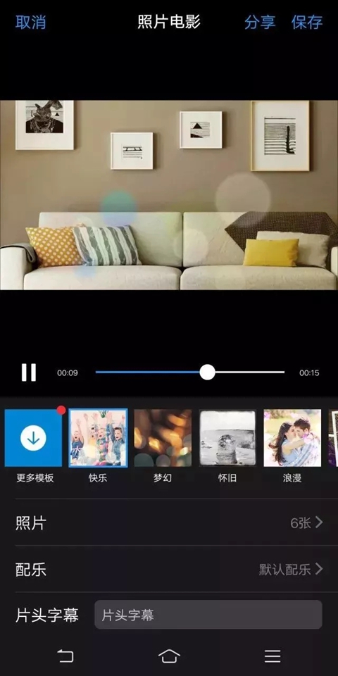 进入相册点击「+」并选择「制作照片电影」,选择你要添加的照片后点击“完成”即可进入照片电影编辑界面,你可以在这里更换模板、更改配乐、设置片头字幕,简单几步即可制作一段个性的照片电影。