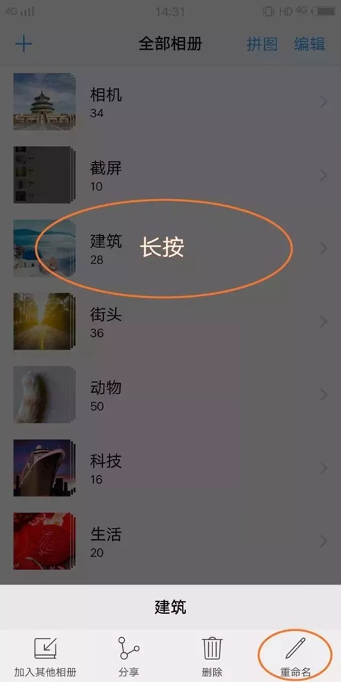 Funtouch OS系统相册为你提供了相册名称修改功能,只需长按某个相册,然后选择“重命名”即可修改名称,两步完成,无需进入「文件管理」修改。