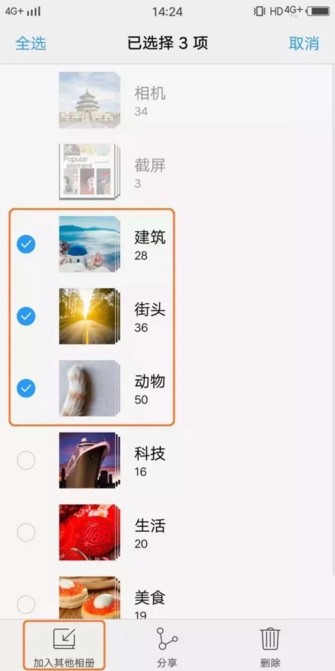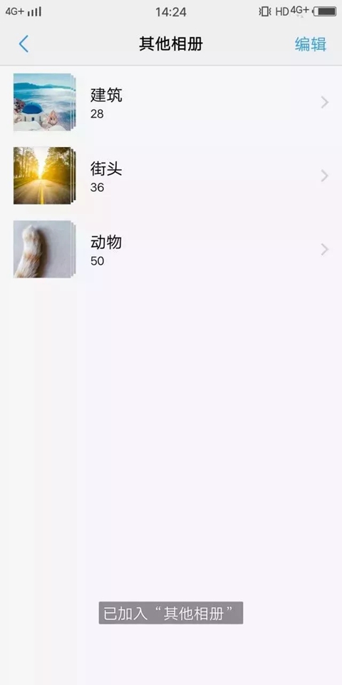 我们早已为你多想一步,相册中出现无用的缓存图片相册时,只需长按这些相册,然后选择“加入其他相册”即可将这些相册移到“其他相册”分类中,两步完成,就是这么简单。