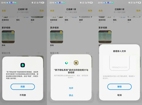 2、接着会出现一系列的提示,这是因为大家第一次使用这个功能,所以大家根据提示选择“同意”“允许”“继续”就可以了。小编看了下,提示大多跟使用相关的权限有关,对用户没有什么影响,然后就是告诉你如何进入“原子隐私系统”查看移入的文件,如上图所示;