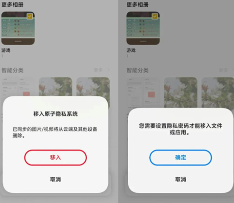 1、打开相册app,切换到下发的“相册”一栏,找到想要隐藏的相册,这里小编就以“游戏”相册为例给大家讲解,长按“游戏”相册,下发会弹出一个提示框,点击“更多”按钮,然后点击“移入原子隐私系统”按钮,如上图所示;