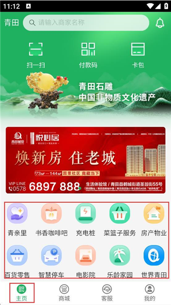 1、下载安装完成之后进入app,可以看到首页有扫一扫、付款码、卡包等功能,还有青亲里、充电桩等特色服务,点击图标即可使用对应生活服务。