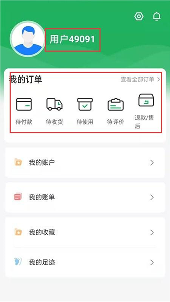 3、个人中心查看用户编号,管理订单待付款、收货等,还有账户、账单、收藏、足迹等功能,方便个人信息和消费记录管理。