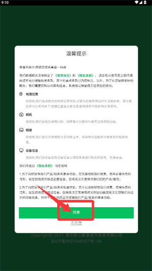 1、启动应用后,请先阅读温馨提示页面的协议条款,点击同意。
