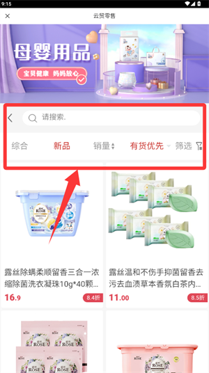 3、进入商品页面后,点击排序功能中的新品选项进行筛选。