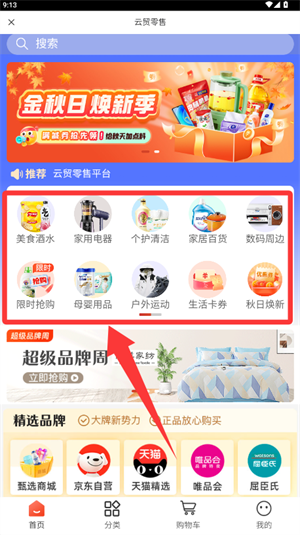 2、在主界面分类选项中,按需选择母婴用品分类等入口。