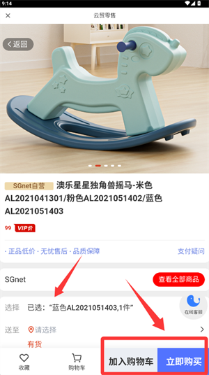 4、在商品详情页面,确认颜色规格后可加入购物车或立即购买。