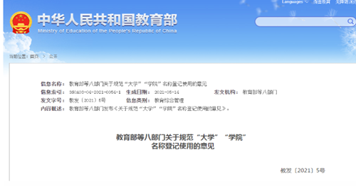 除经批准设立的大学、学院以及由其设立的内部机构或由其发起并依法登记的组织机构外,其他组织机构不得在牌匾、广告等对外宣传以及其他各类活动中使用“大学”“学院”字样。