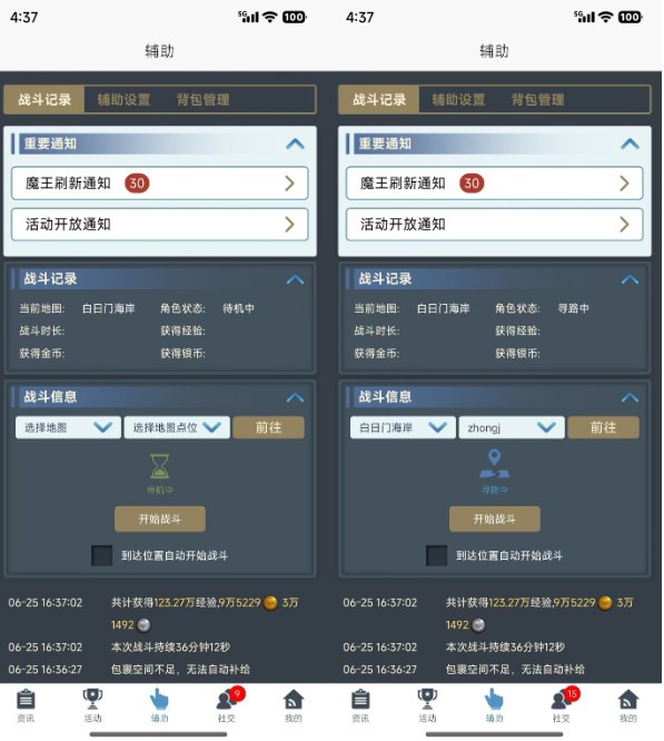 战斗信息包含两部分,第一部分为可操作部分,可以通过已设置的寻路点功能操作角色前往指定地图的寻路点进行自动战斗,必须提前设置了寻路点才能进行相关前往操作。开启自动战斗时,召唤物自动切换为攻击状态,停止自动战斗召唤物仍为攻击状态;第二部分是最下方会同步显示自动战斗的详细信息。