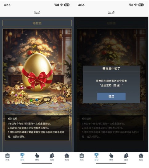 绑定角色后可以在活动页内参与砸金蛋活动,每个角色每日参与1次,活动奖励会发送到对应的绑定角色邮箱内。