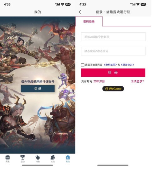 除资讯页外,访问其他页签都需要先登录账号并绑定角色后才能使用。需要使用盛趣通行证账号和静态密码或动态密码的方式进行登陆