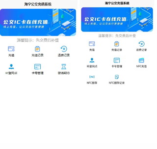 2、点击界面左上方“公交”,点击“公交IC卡在线充值”进充值系统。(下如图:左IOS系统,右安卓系统NFC版)