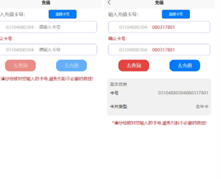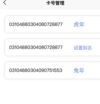 4、常用卡号,用户可在充值成功后,到“卡号管理”内对该卡进行“设置别名”,设置完成后,在“充值”界面可点击“选择卡号”进行充值,无须再手动输入卡号。“卡号管理”内,长按已设置别名卡号可进行删除该卡。