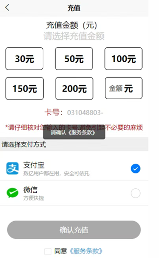 5、查询验证卡号后,可进行充值,选择充值金额或自定义充值金额。(30元起充,10元的倍数)
