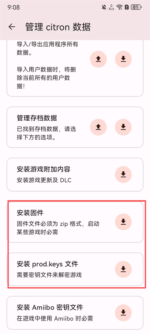 2、进入管理Citron数据页面,在导入游戏前需先安装固件和密钥,点击右侧的下载按钮;