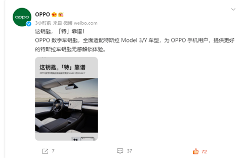 OPPO宣布数字车钥匙全面适配特斯拉Model3/Y车型,为OPPO手机用户,提供更好的特斯拉车钥匙无感解锁体验。