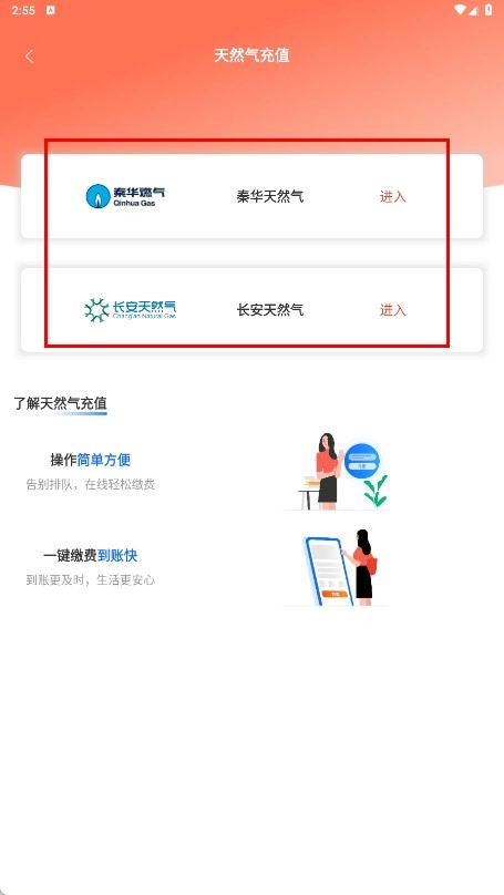 2、选择天然气供应商,如【秦华天然气-选项】或【长安天然气-选项】,点击进入。