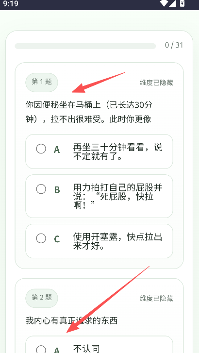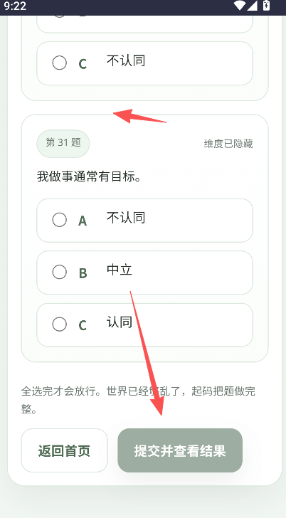 4、在答题完毕以后,点击底部的提交,之后就会给出专业的测试判断到用户本人哦。